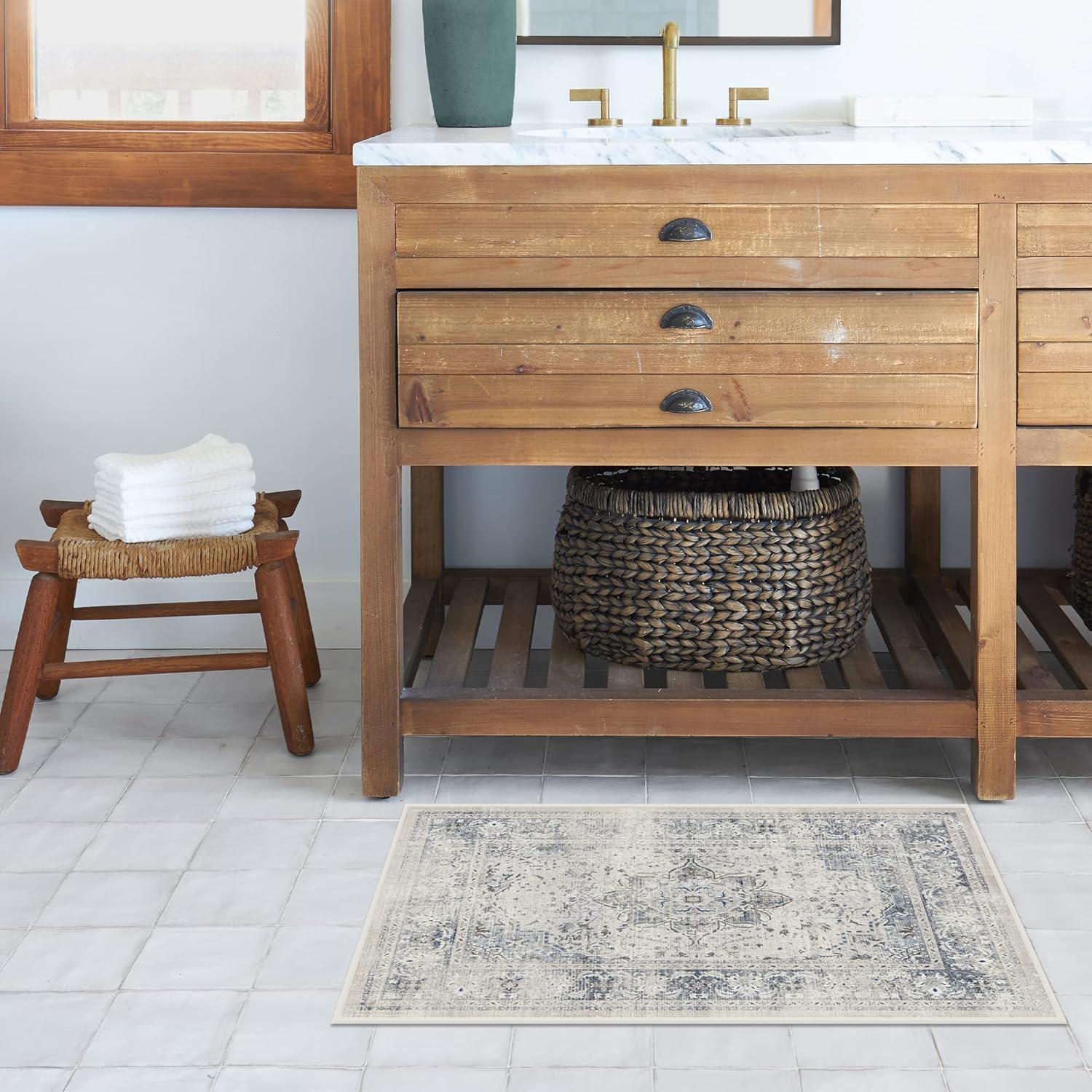 RUGGABLE Washable Vintage Area Rug – Kamran Hazel 3×5, Stain-Resistant, Non-Slip – Small Machine Washable Rugs for Living Room, Bedroom, Hallway, Entryway & Office–with Standard Pad(Blue Quartz Distressed- Kamran – Cushioned Pad)