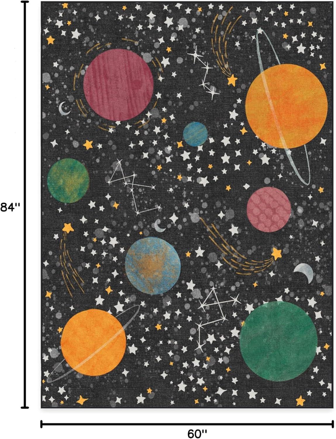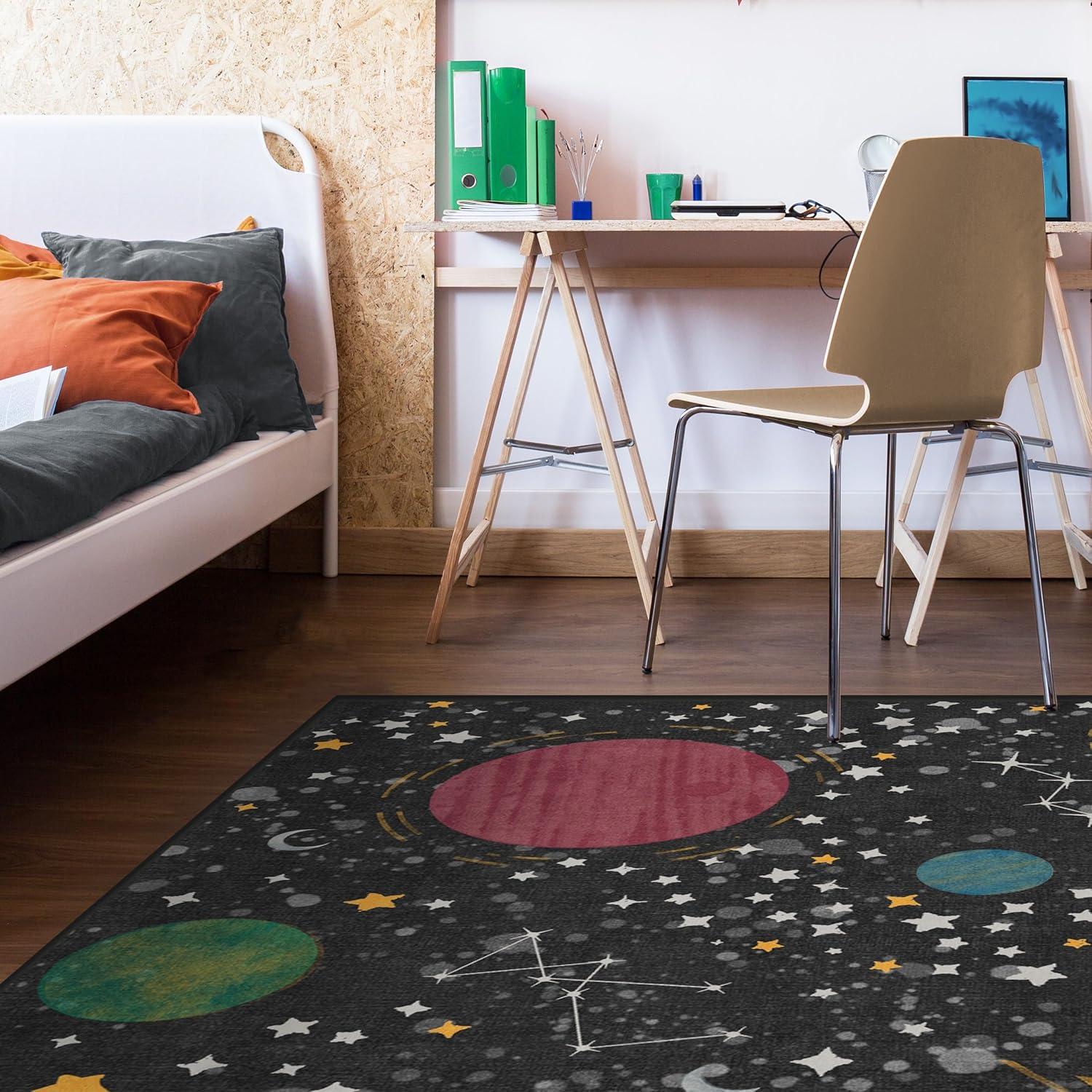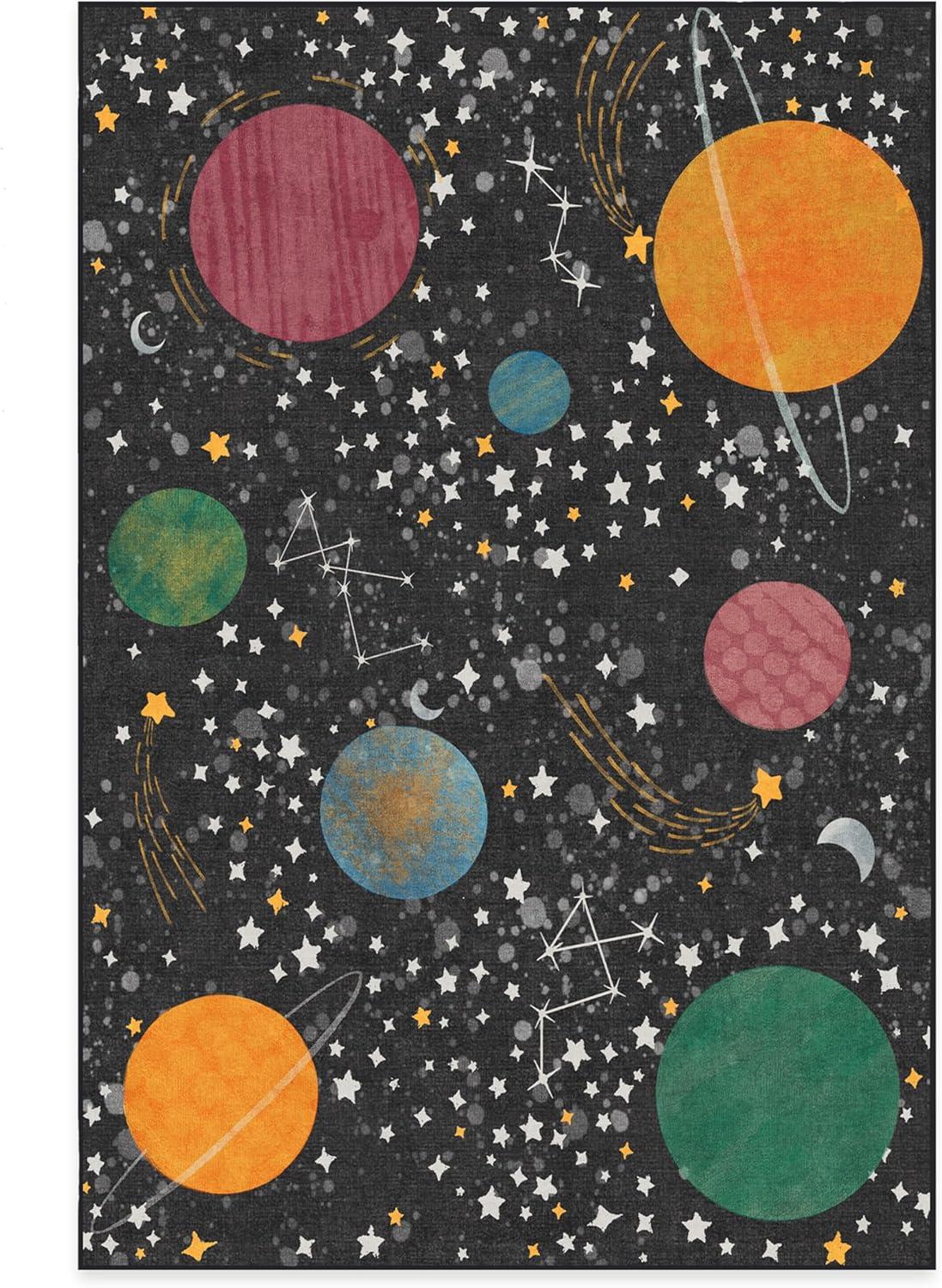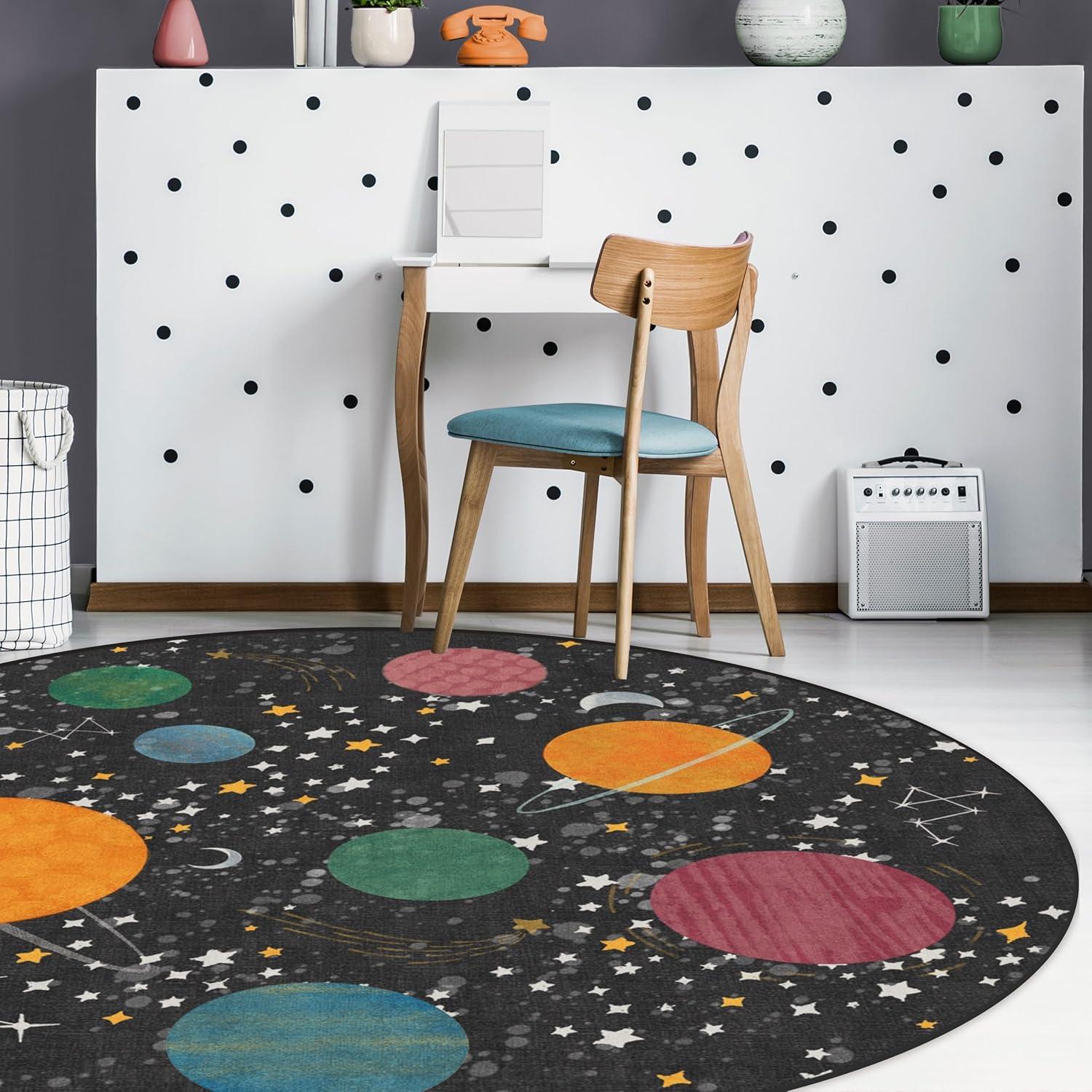 RUGGABLE Washable Area Rug – Dinosaurs in Space 6 ft Round, Stain-Resistant, Non-Slip – Medium Machine Washable Rugs for Living Room, Bedroom, Hallway, Entryway & Office–with Standard Pad(Outer Space Black – Cushioned Pad)