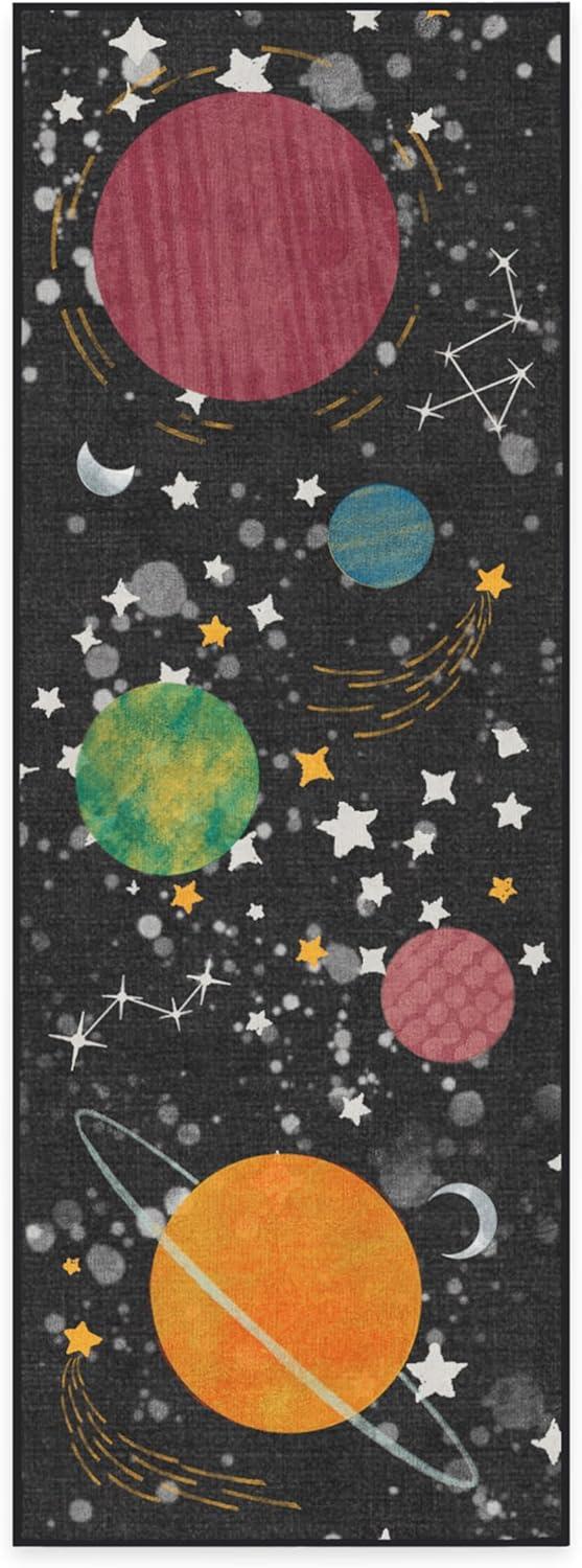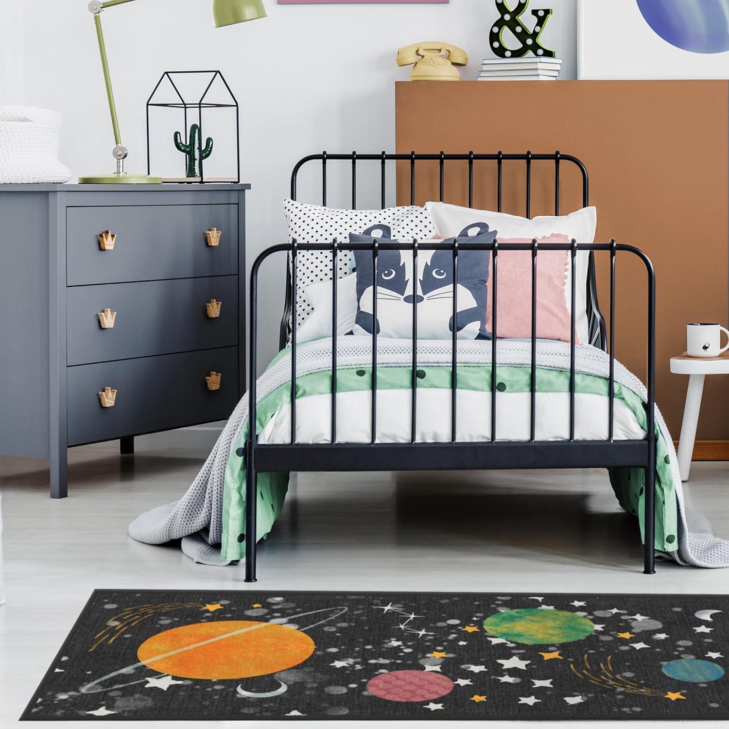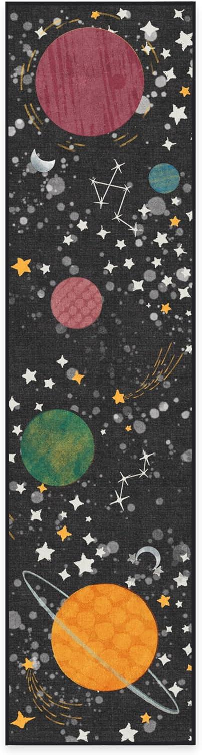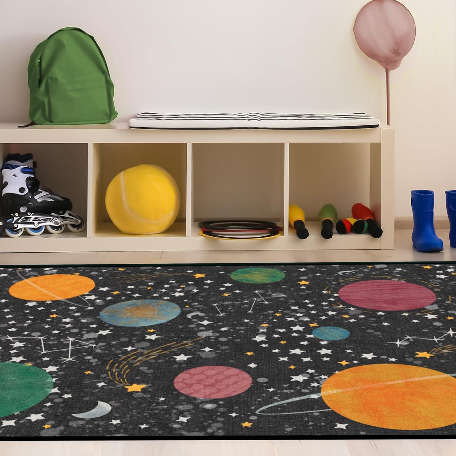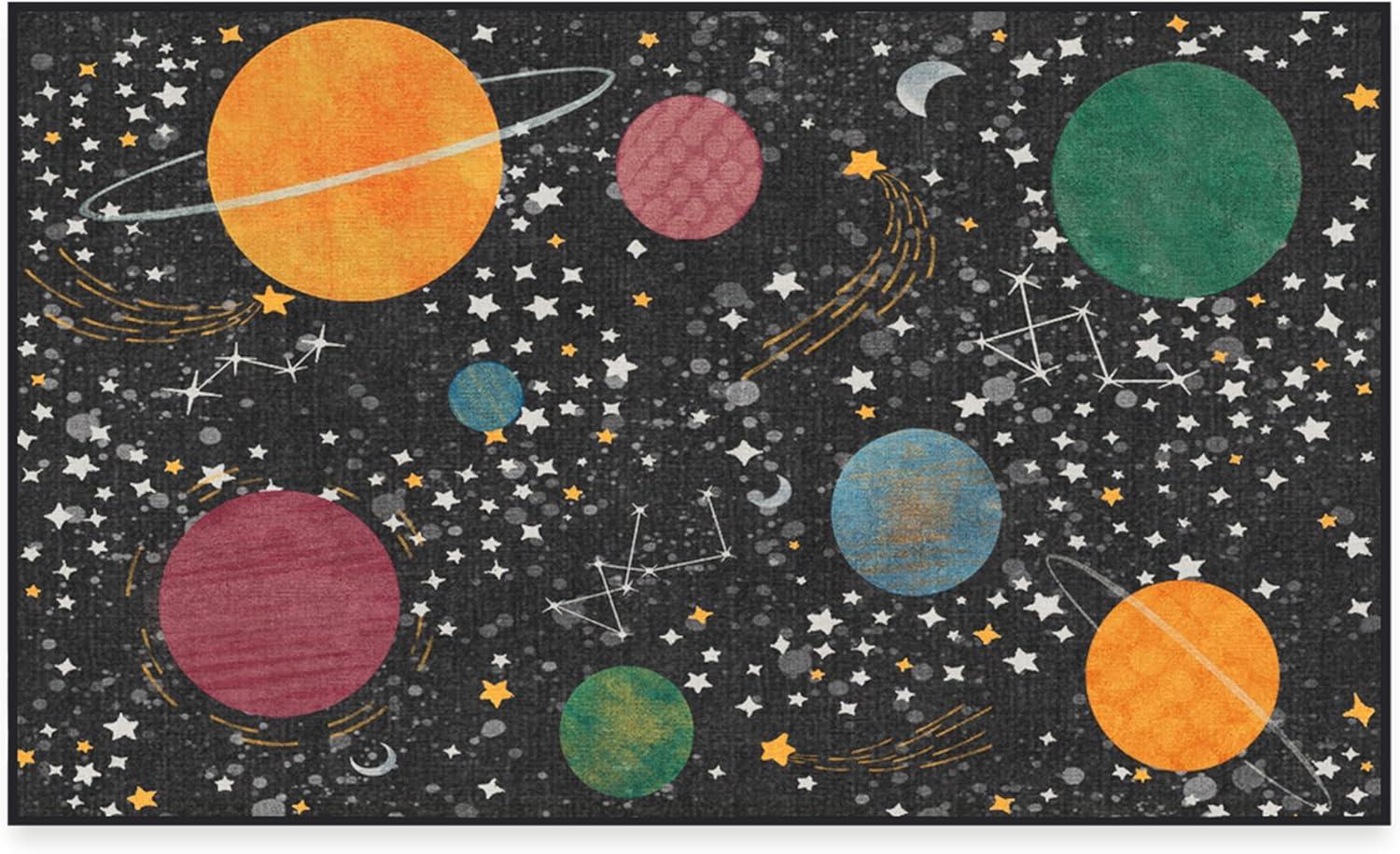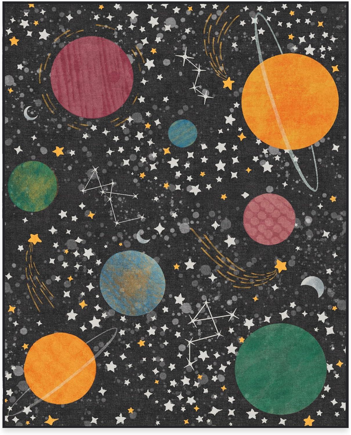 MODERN RUG TECHNOLOGY: Whimsically drawn dinos in spacesuits float upon a galaxy of planets, shooting stars, the moon, and constellations rendered in textured tones of leaf green, turquoise, navy blue, and neutral grey, this kids' room rug will surely delight your little astronaut or science buff