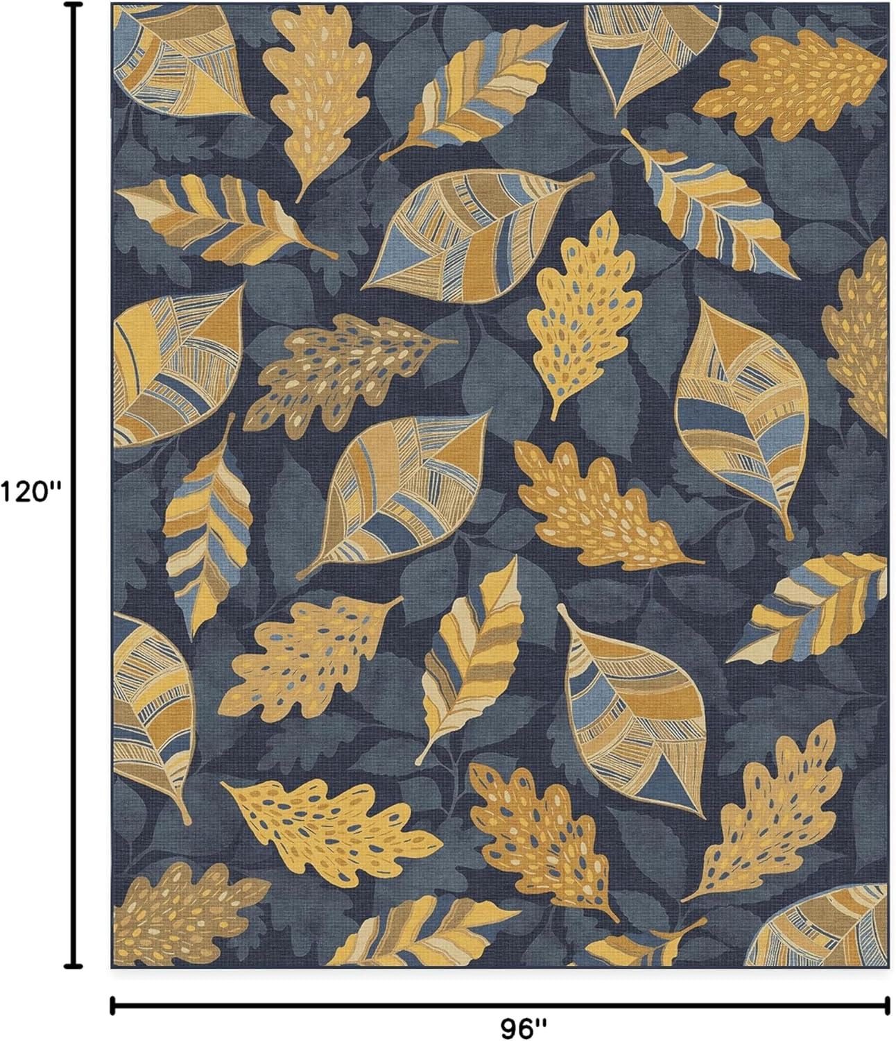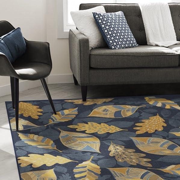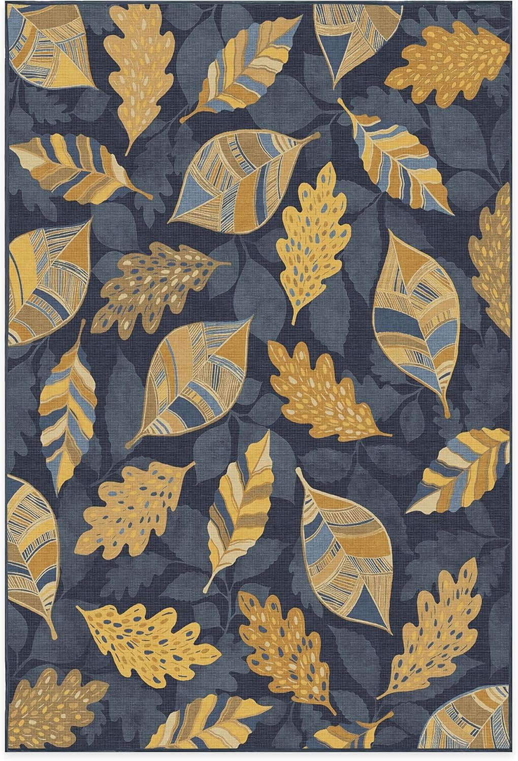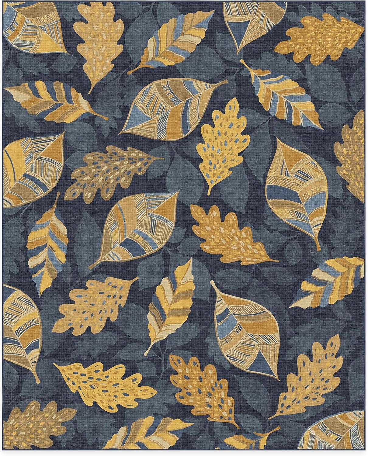 SAY HELLO TO FALL: Designed with gold-colored leaves against a dark blue background, our Aurelia Navy Gold Rug is ready to warm up any space. The varied patterns with a silhouetted background of falling leaves bring dimension and layers to this seasonal rug with a festive fall vibe.