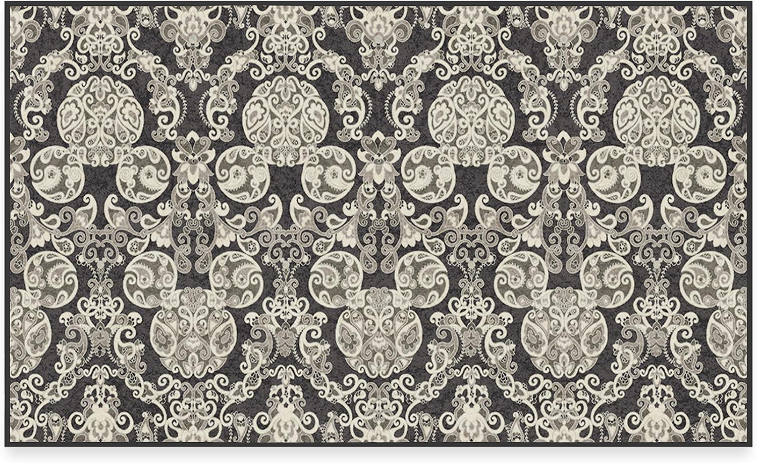MODERN RUG TECHNOLOGY: Hidden inside this traditional and elaborate damask motif are many renditions of Mickey Mouse, colored in a pop of pearl against a charcoal background; Discover a new hidden Mickey every day with this elegantly designed Disney rug