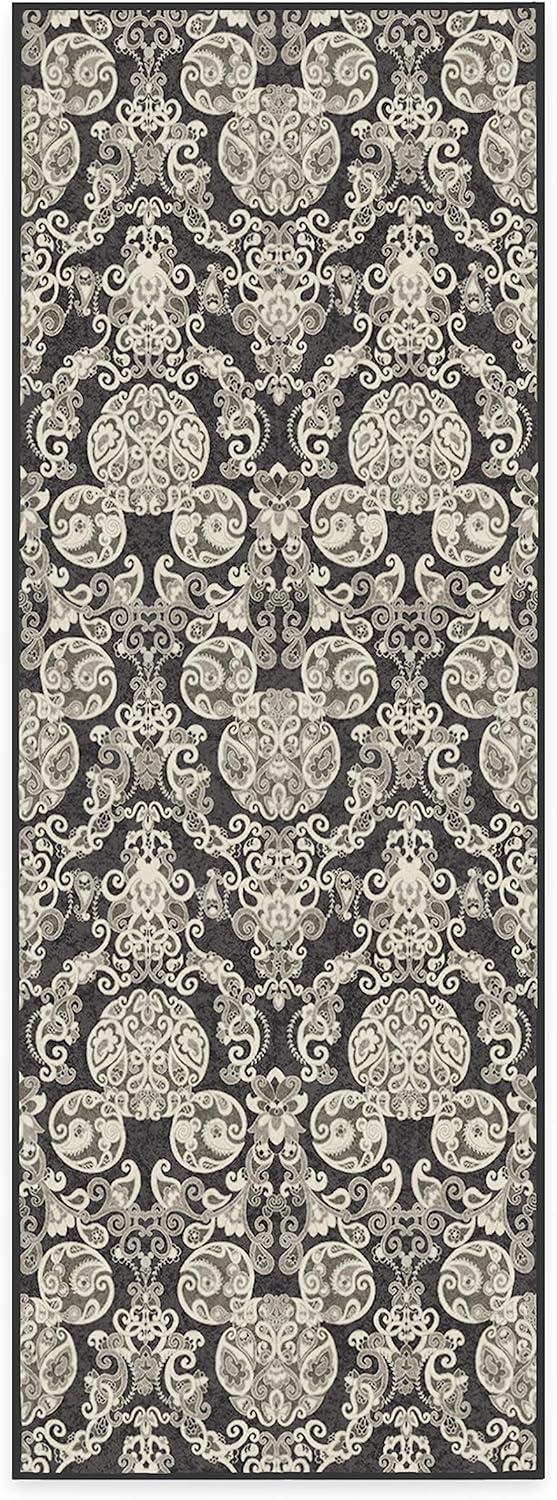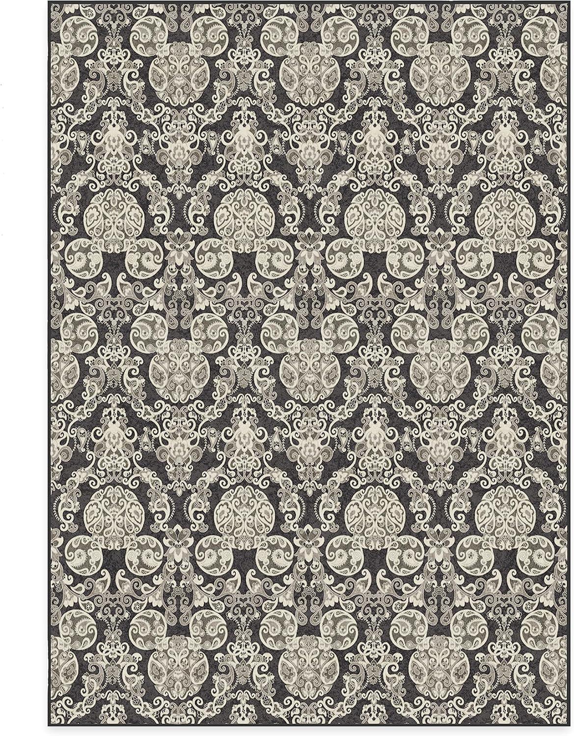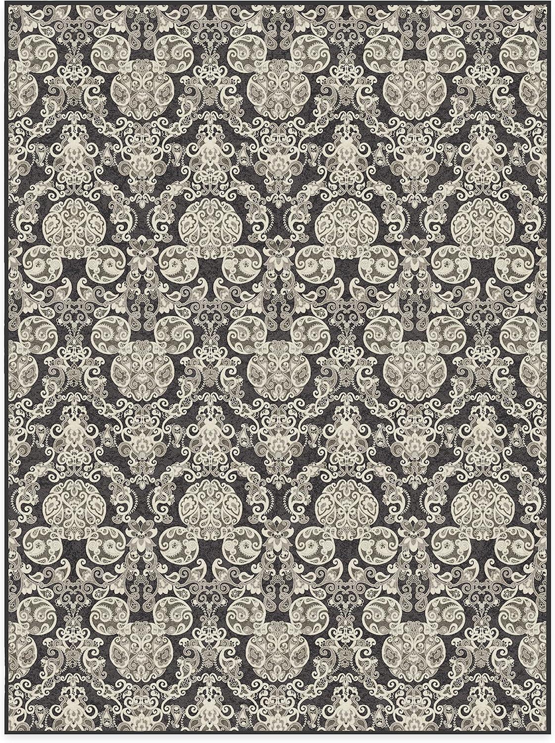 MODERN RUG TECHNOLOGY: Hidden inside this traditional and elaborate damask motif are many renditions of Mickey Mouse, colored in a pop of pearl against a charcoal background; Discover a new hidden Mickey every day with this elegantly designed Disney rug