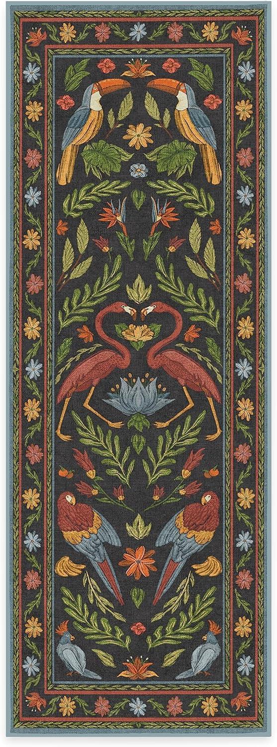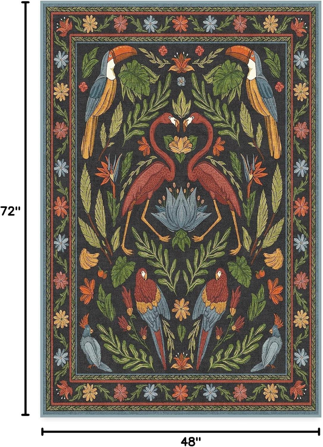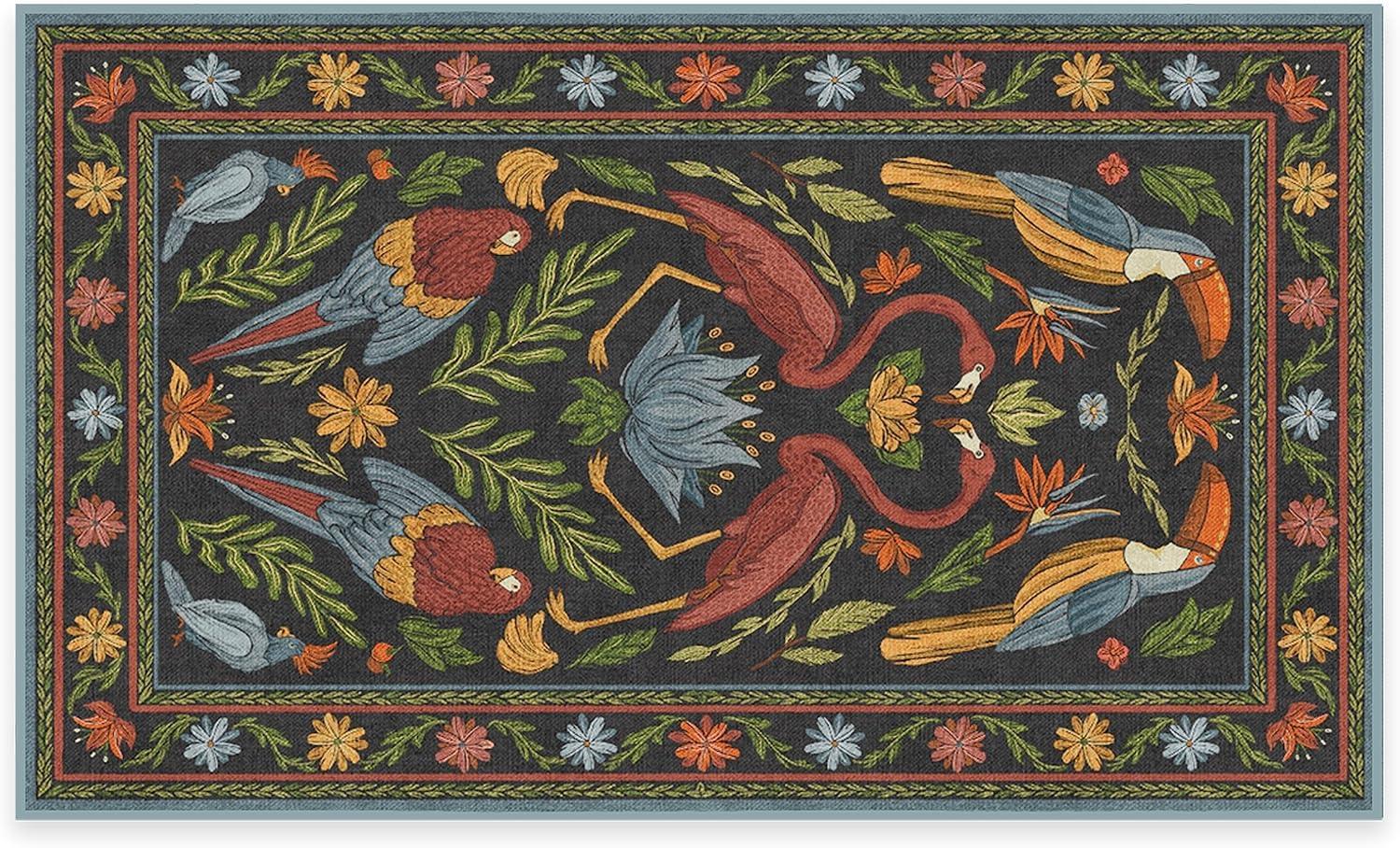 BRING HOME AN ICON: Crafted in collaboration with Iris Apfel, this maximalist washable rug features a bright celebration of tropical birds in a jewel-toned palette of blue, pink, yellow, and teal green on an light tan background