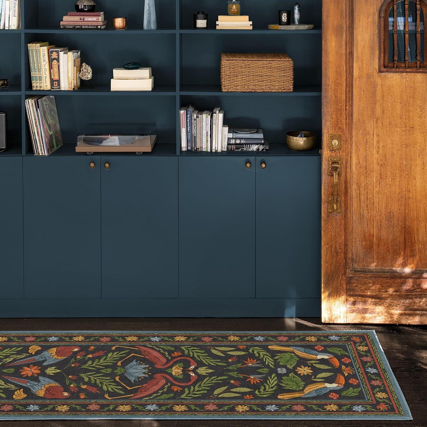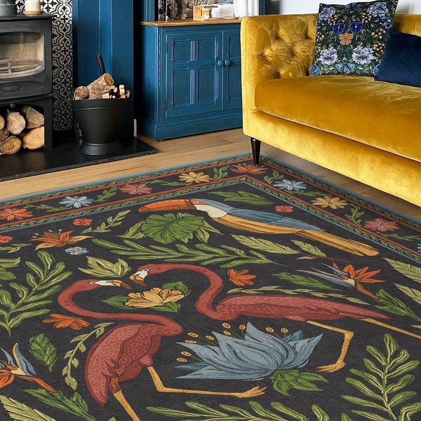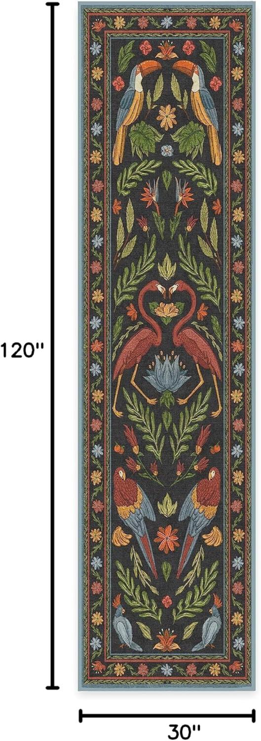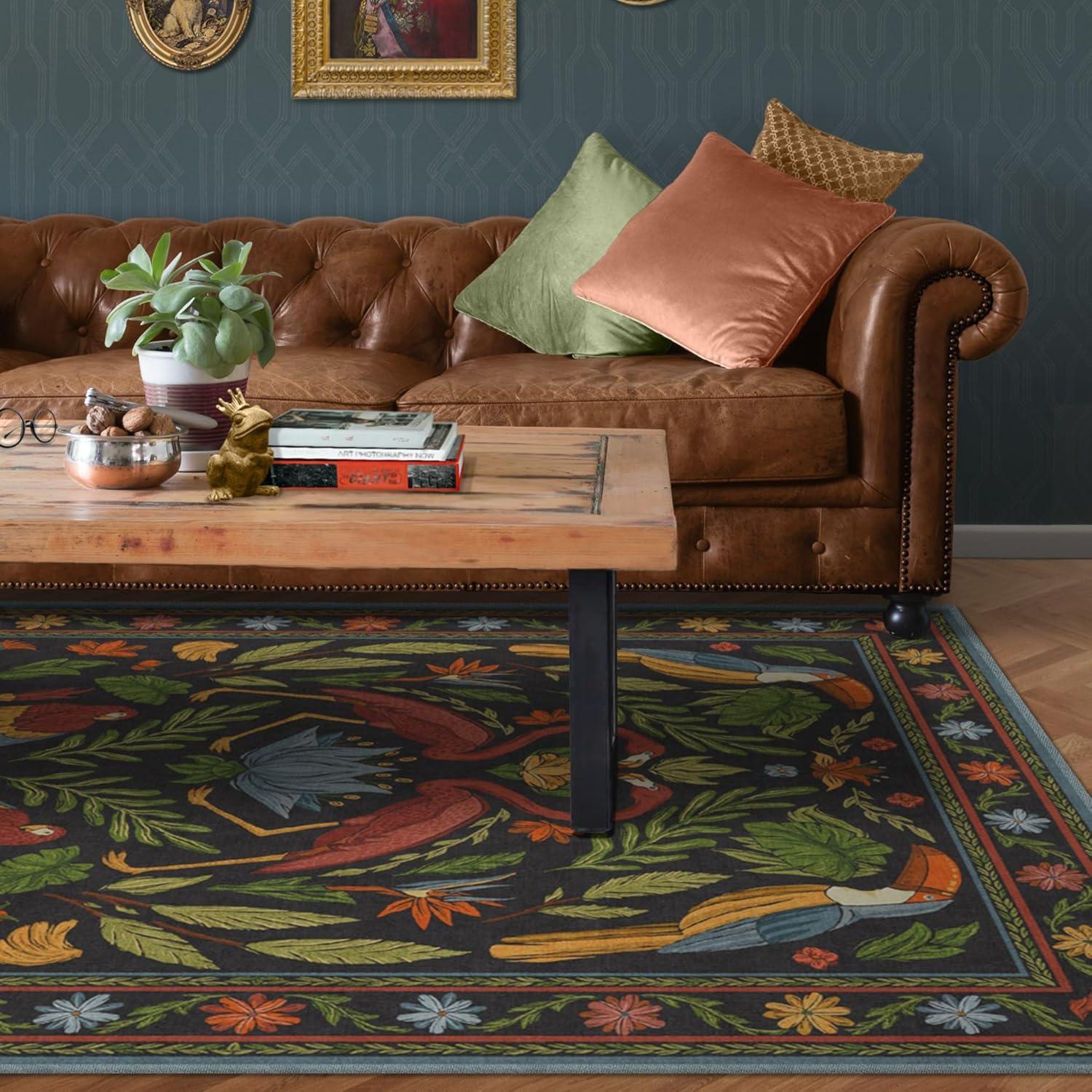 BRING HOME AN ICON: Crafted in collaboration with Iris Apfel, this maximalist washable rug features a bright celebration of tropical birds in a jewel-toned palette of blue, pink, yellow, and teal green on an light tan background