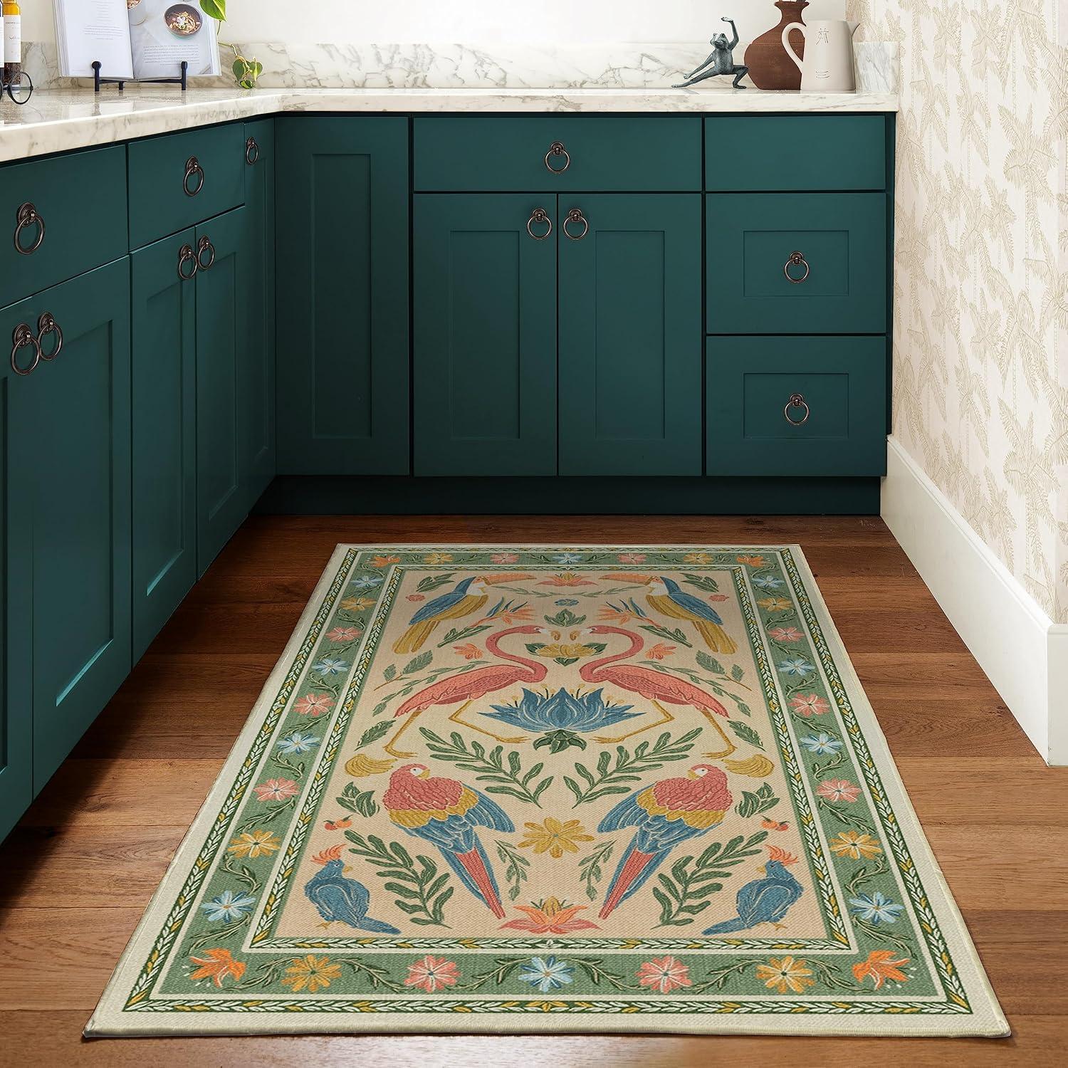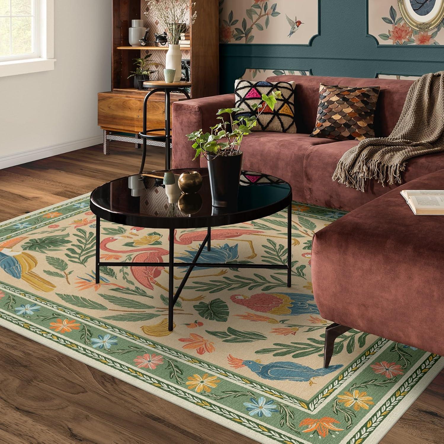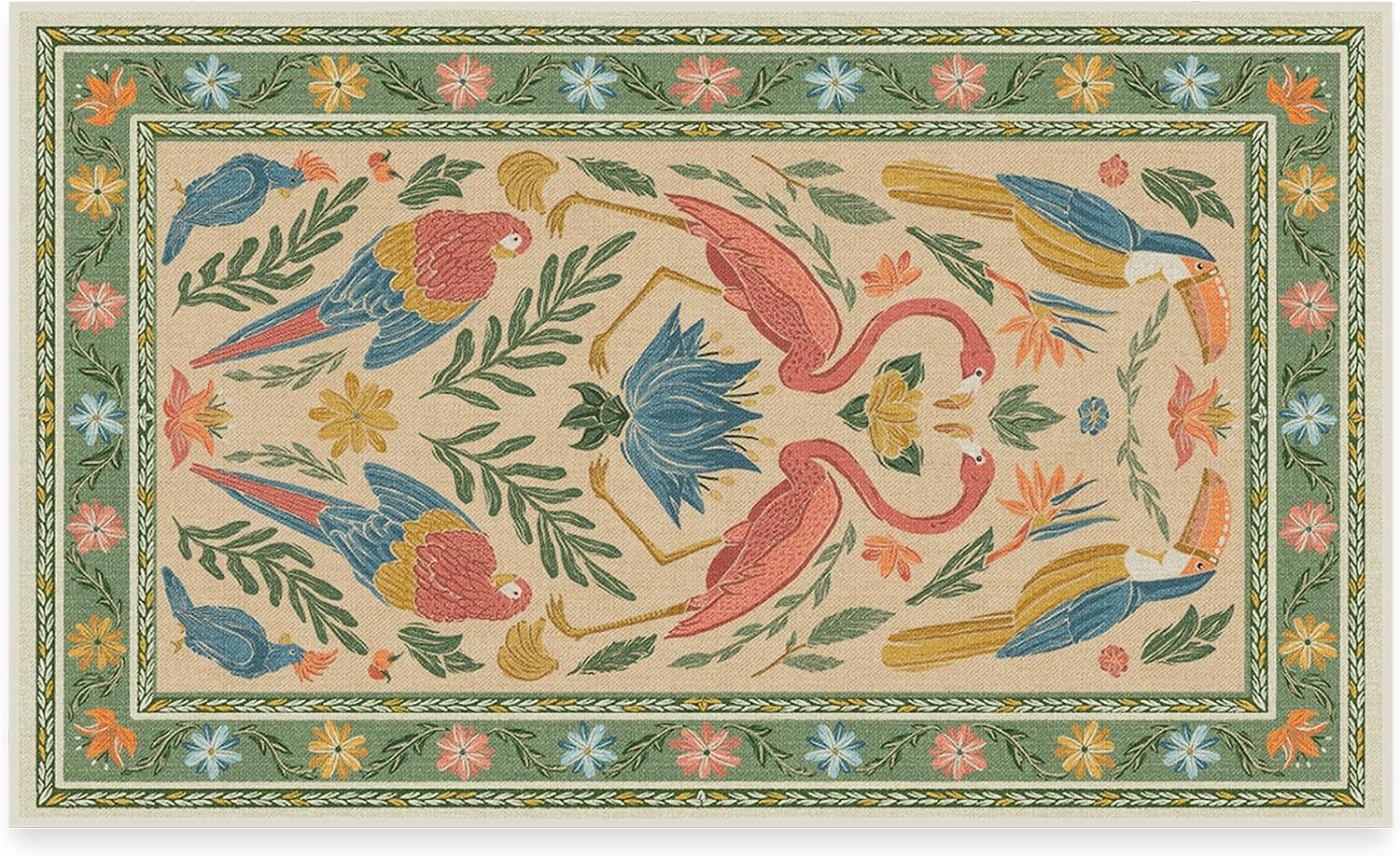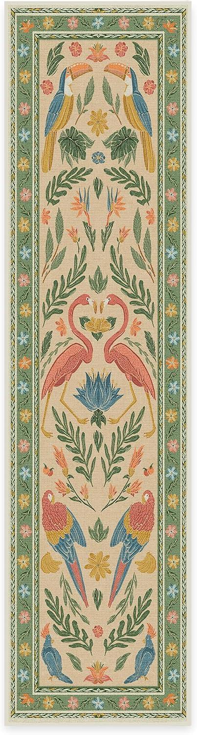 BRING HOME AN ICON: Crafted in collaboration with Iris Apfel, this maximalist washable rug features a bright celebration of tropical birds in a jewel-toned palette of blue, pink, yellow, and teal green on an light tan background