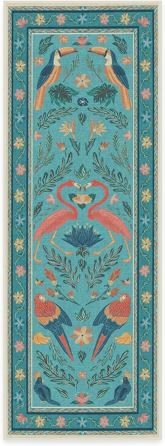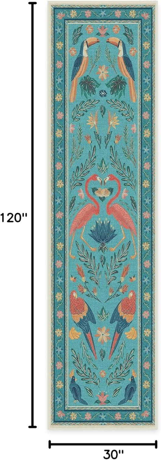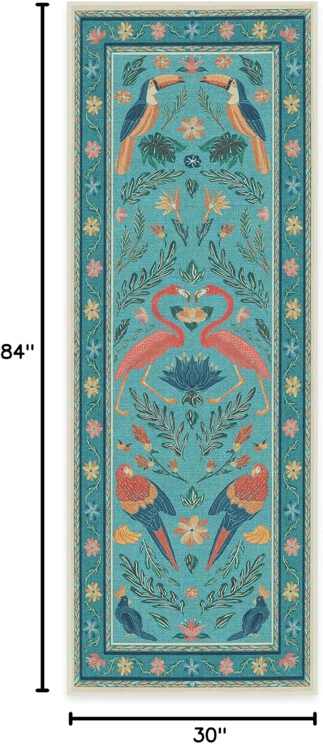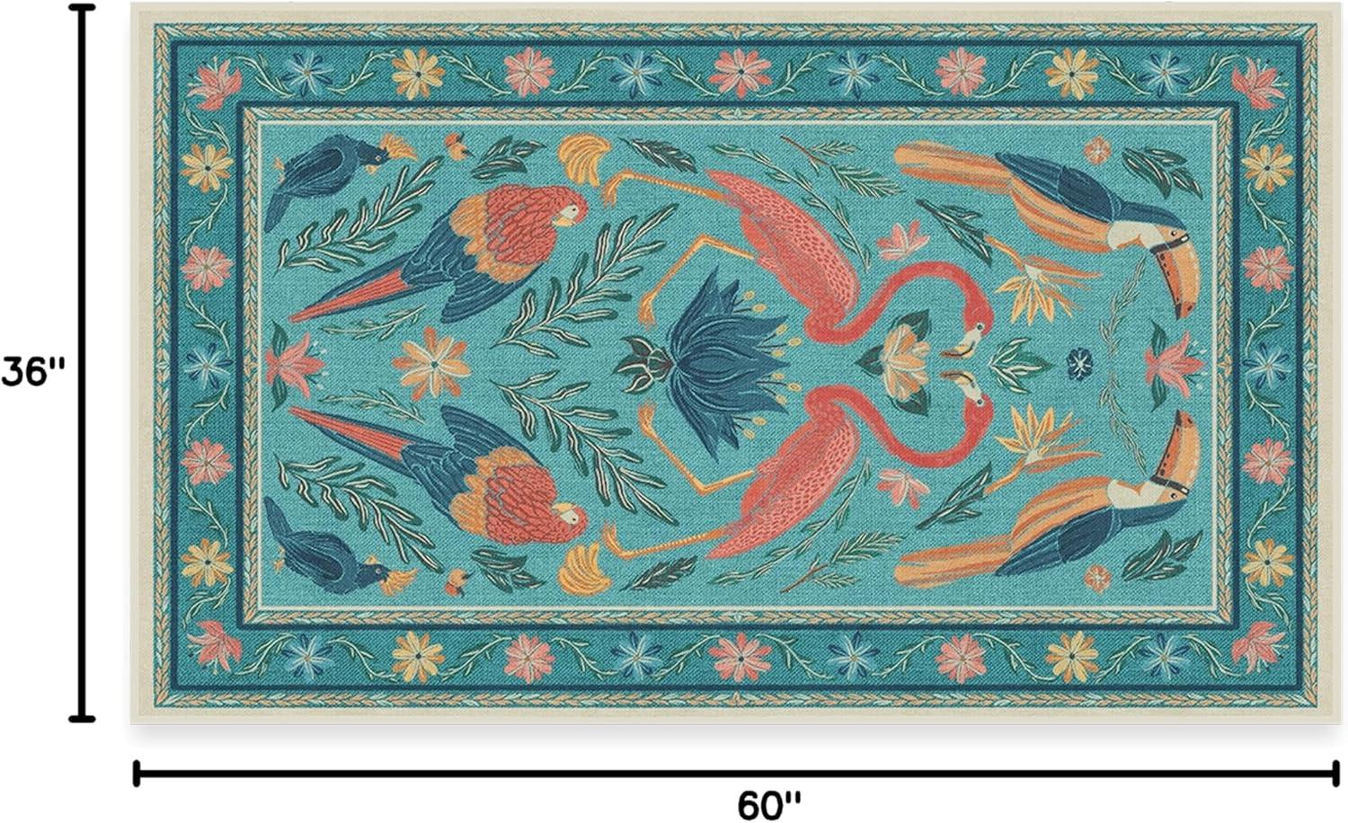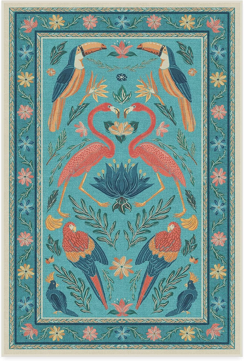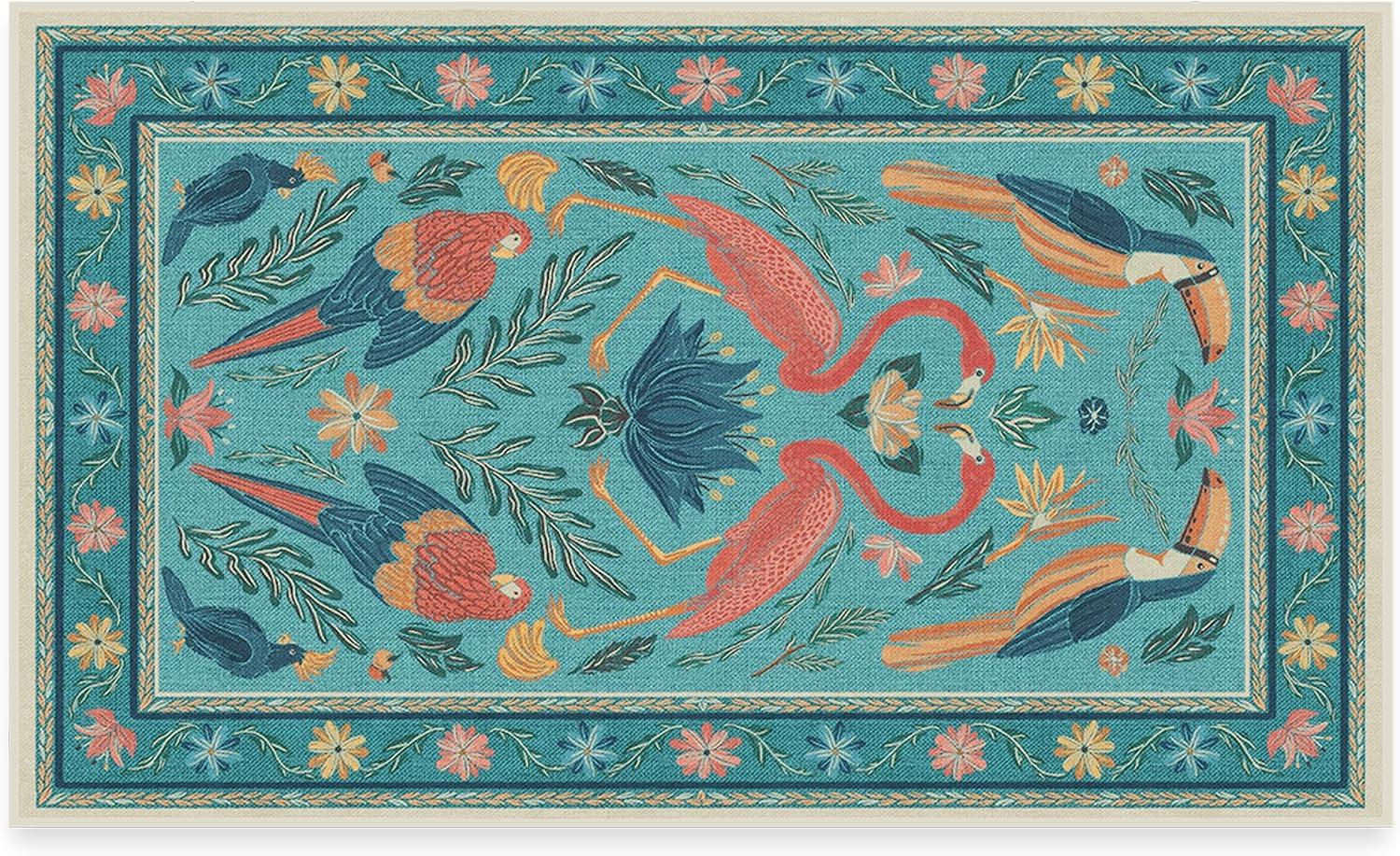 BRING HOME AN ICON: Crafted in collaboration with Iris Apfel, this maximalist washable rug features a bright celebration of tropical birds in a jewel-toned palette of blue, pink, yellow, and teal green on an light tan background