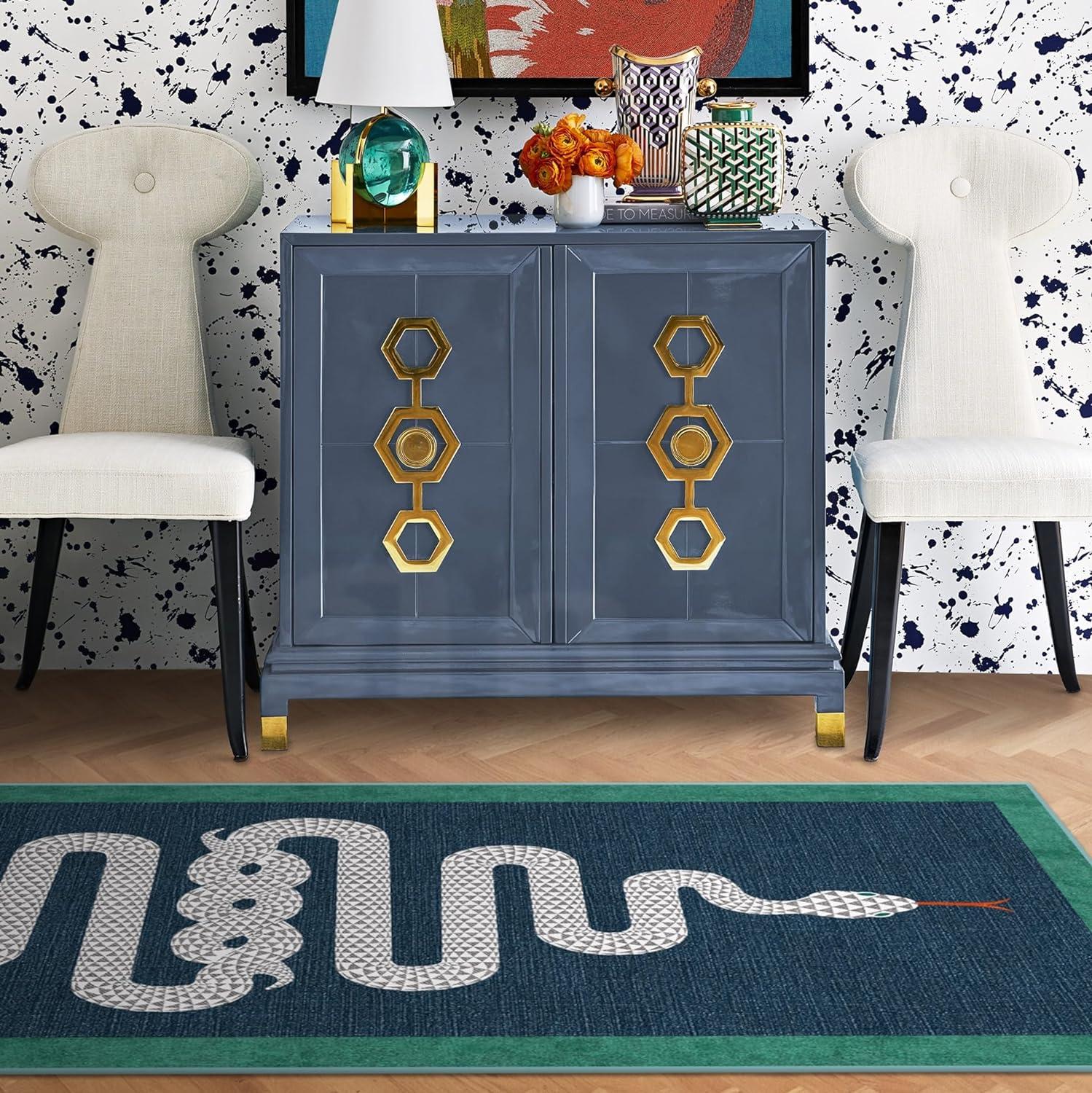 RUGGABLE x Jonathan Adler Machine Washable Modern Runner Rug – Inkdrop Camel & Ivory 2.5×7, Stain-Resistant, Non-Slip – Washable Rug for Hallway, Entryway, Living Room & Kitchen–with Standard Pad(Venom Sapphire – Standard Pad)