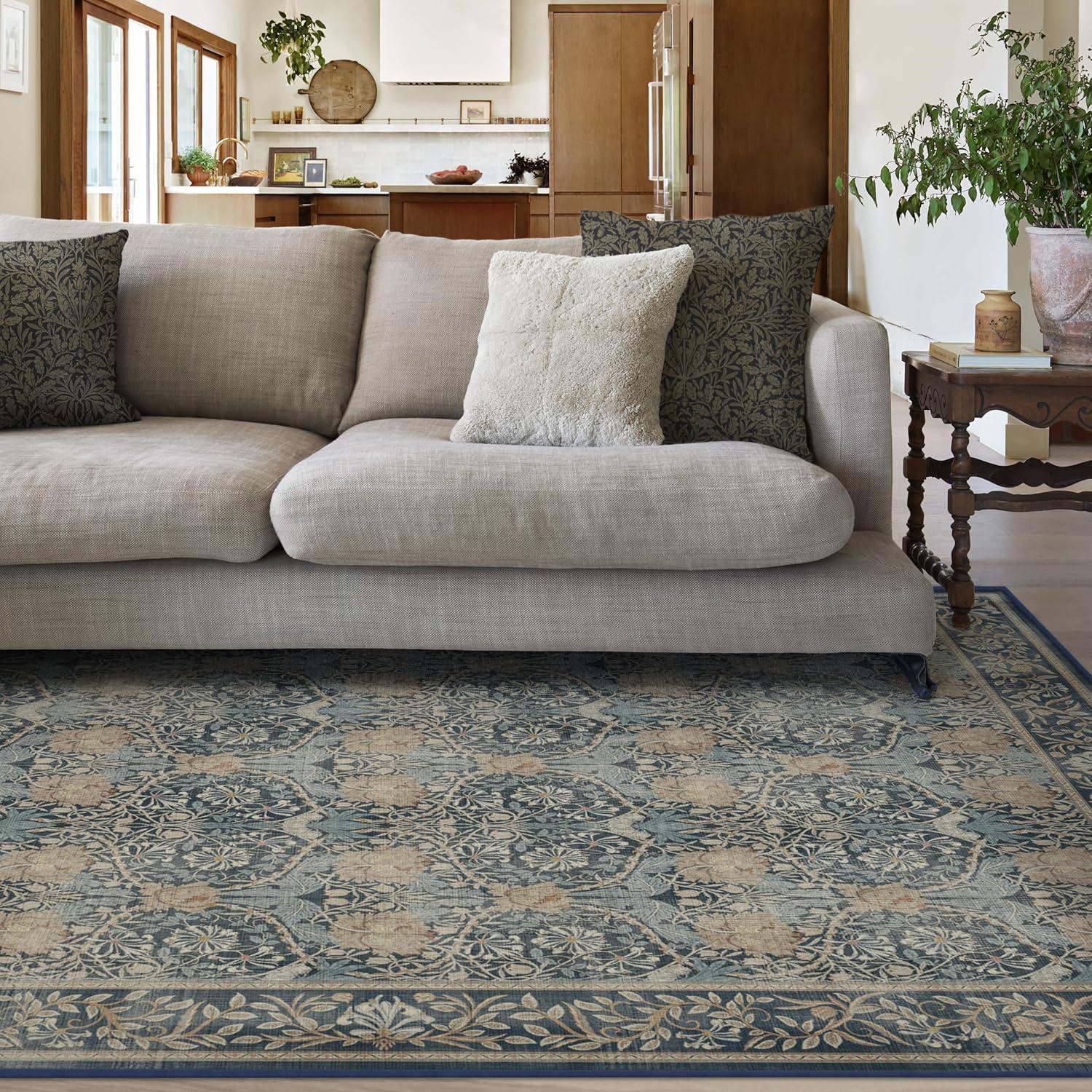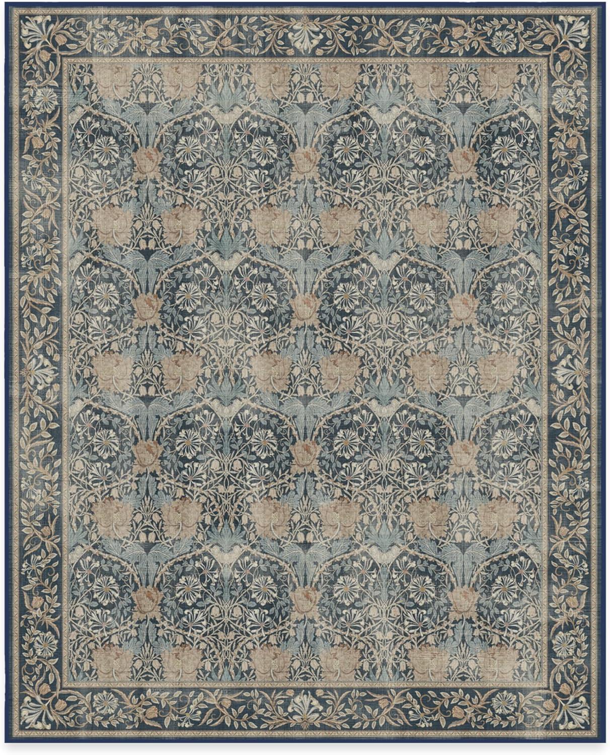 WHIMSICAL DESIGN, MODERN RUG TECHNOLOGY: A direct translation of William Morris's recognizable block print textile, this rug contrasts deep indigo blue with fresh reds, mossy greens, and golden highlights.